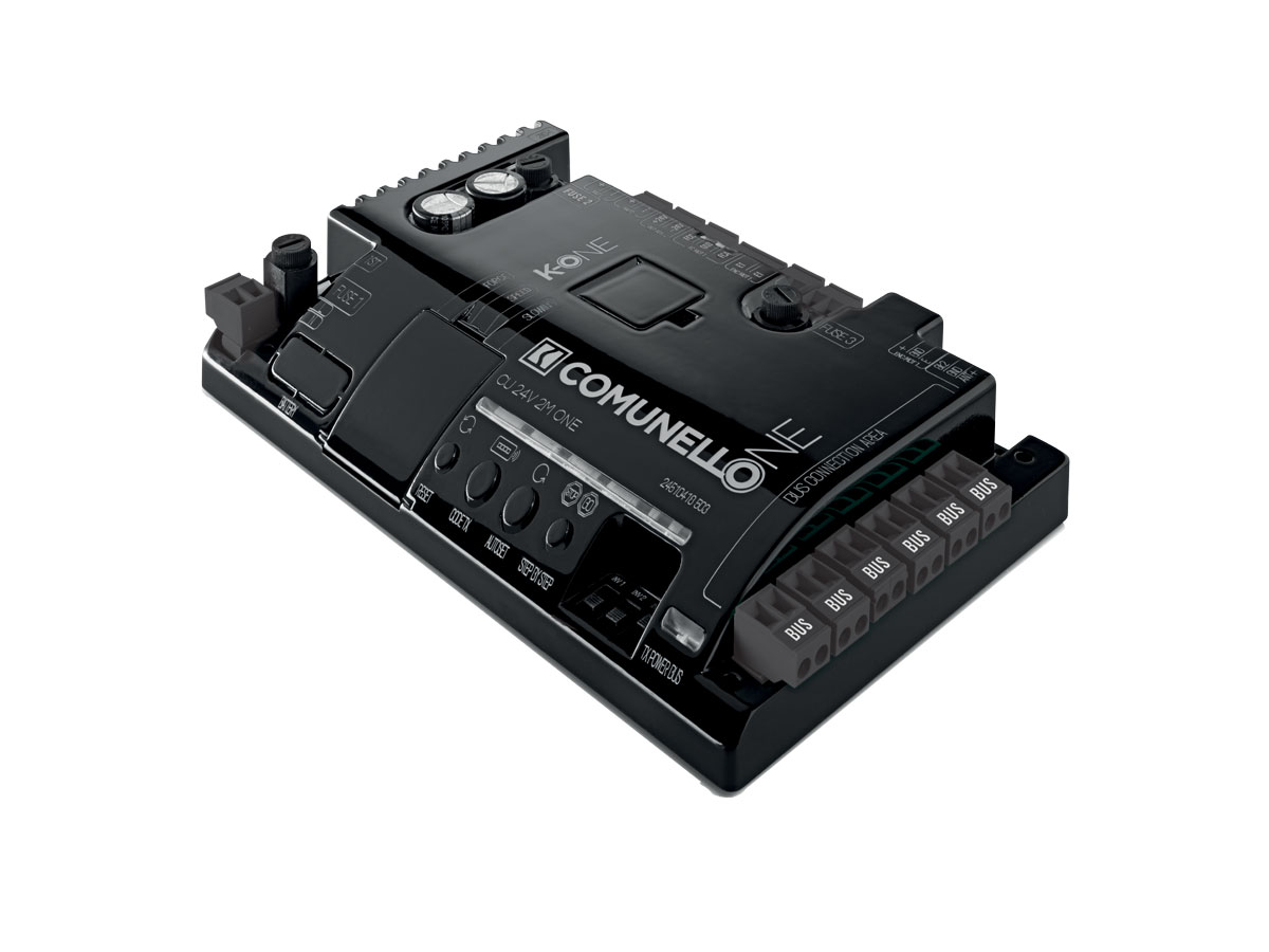Logica di funzionamento a microprocessore, doppio ingresso encoder magnetico e finecorsa elettrico per primo e secondo motore. Programmazione base da scheda tramite trimmer e dip-switches; programmazione evoluta tramite App Comunello One e accessorio K-One